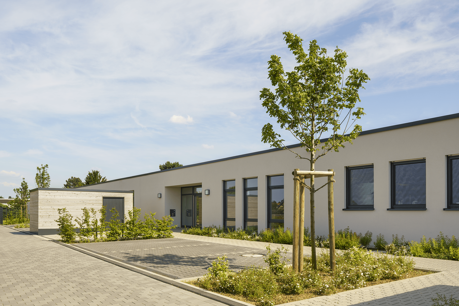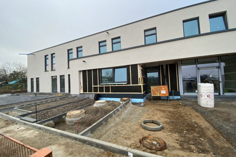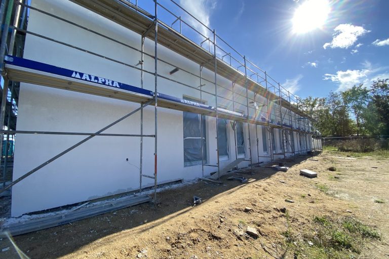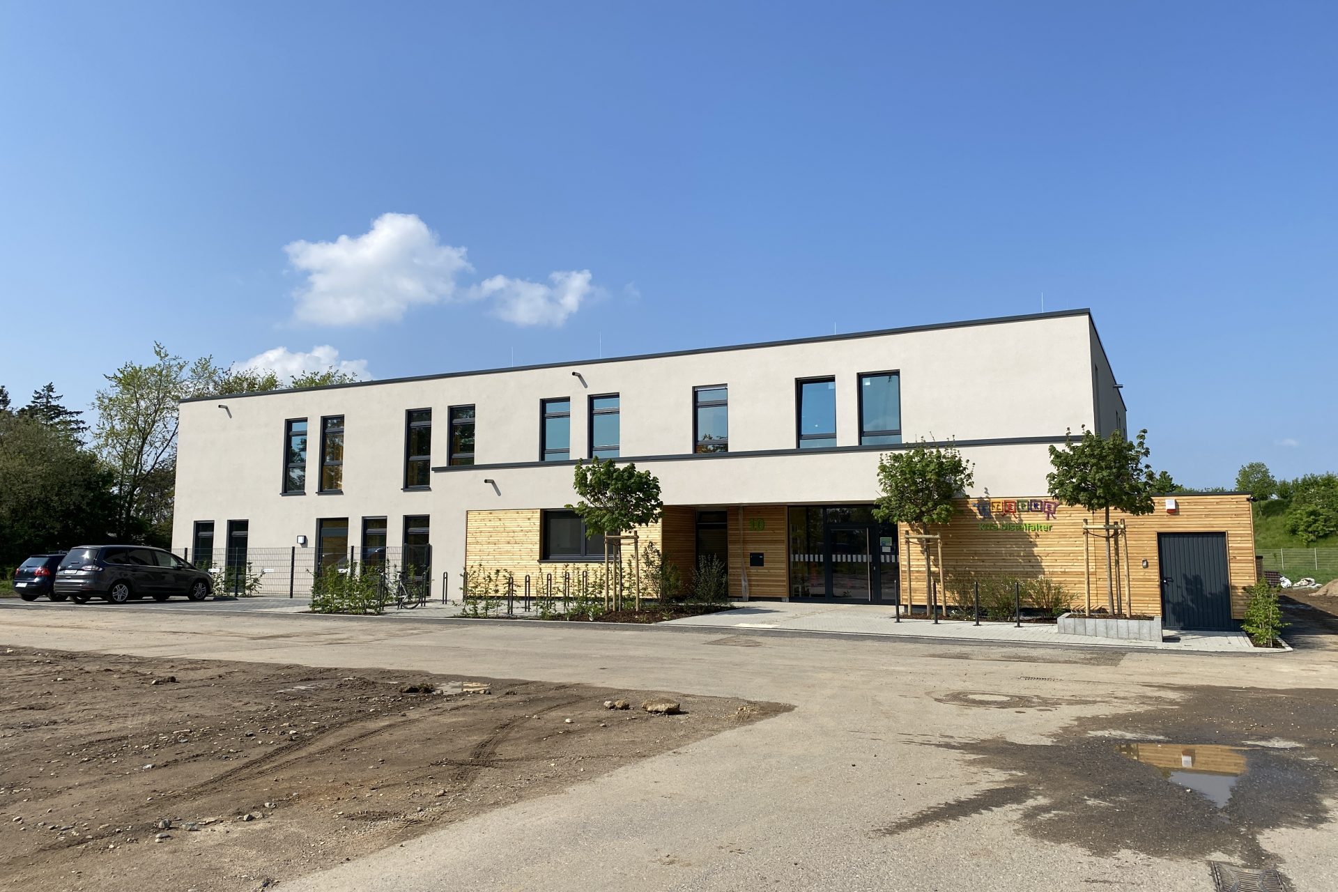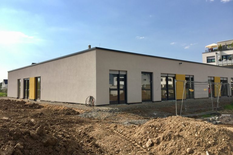 Fertig gedämmt und weiß verputzt, strahl die neue Kita, welche noch vor kurzen von grauem Beton geprägt wurde.