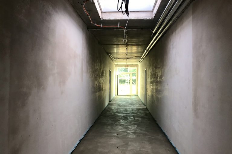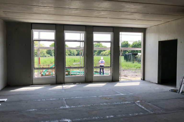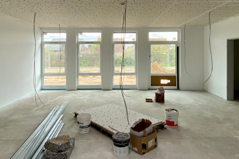 Momentan trocknet der Estrich in der Kita „Am Hahnacker“ in Erftstadt-Liblar, während die Arbeiten an der Fassade und dem Dach der neuen Kita und den neun Wohnungen darüber weiter schnell…