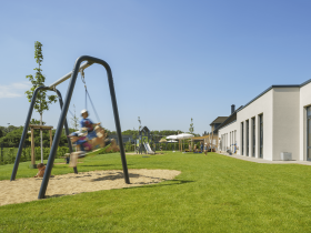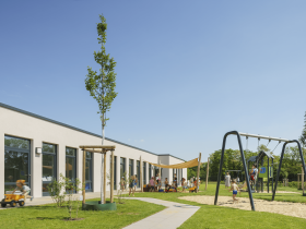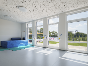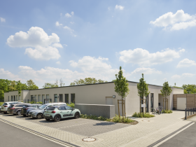 Die Kita Kierdorfer Ströpp liegt am Ende der Matthias-Grell-Straße in Kierdorf im nordöstlichen Stadtteil von Erftstadt. Die knapp 12 Kilometer vor den Toren Köln befindliche 4-gruppige Kindertageseinrichtung konnte nach knapp neun Monaten Bauzeit im Oktober 2019 an die Lebenshilfe im Rhein-Erft-Kreis e.V. (Mieterin) übergeben werden. Seit Januar 2020 werden hier 56 Kinder mit und ohne Behinderung gemeinsam betreut. Neben der Gruppe für Kinder unter 3 Jahren finden Sie dort eine Gruppe für Kinder über 3 Jahren, eine Alters- und fördergemischte Gruppe sowie eine rein heilpädagogische Gruppe. Das 1- geschossige barrierefreie Gebäude mit sehr großzügigem Freibereich im süd-östlichen Grundstücksbereich bietet den Kindern aus allen Gruppen-, Neben-, und Schlafräumen einen Blick ins benachbarte Feld oder den angrenzenden Wald. Die Kita wurde in Massivbauweise mit einem Gründach errichtet.